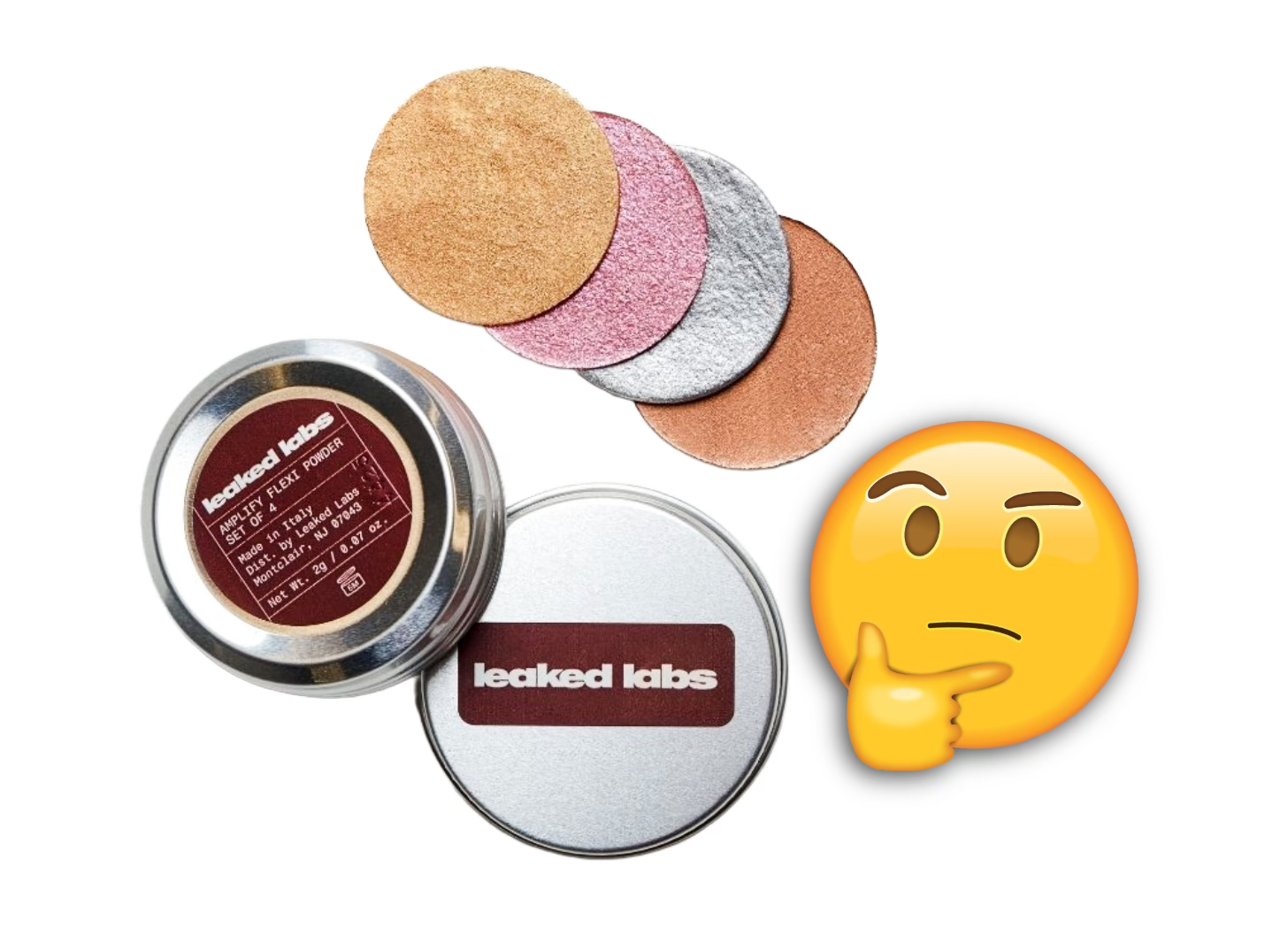 The Leaked Labs debut product, Leak 001: Amplify Flexi Powder, is a pigment disc built on a carrageenan-based flexible membrane technology that reactivates when dampened with water or setting spray. Amplify Flexi Powder was retailed as a set of four of these flexible discs in metallic shades, housed in a small generic tin with sticker labeling, for $34.00 USD ($40 with shipping).